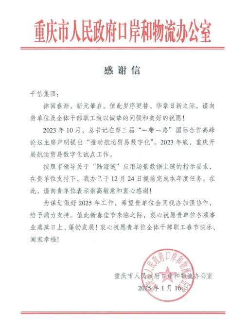 1月16日,千信集团收到了一封来自重庆市人民政府口岸和物流办公室的感谢信。信中肯定了千信集团2024年在“陆海链”应用场景数据上链工作中的贡献,希望千信集团继续推进相关工作,在2025年贡献更多力量。