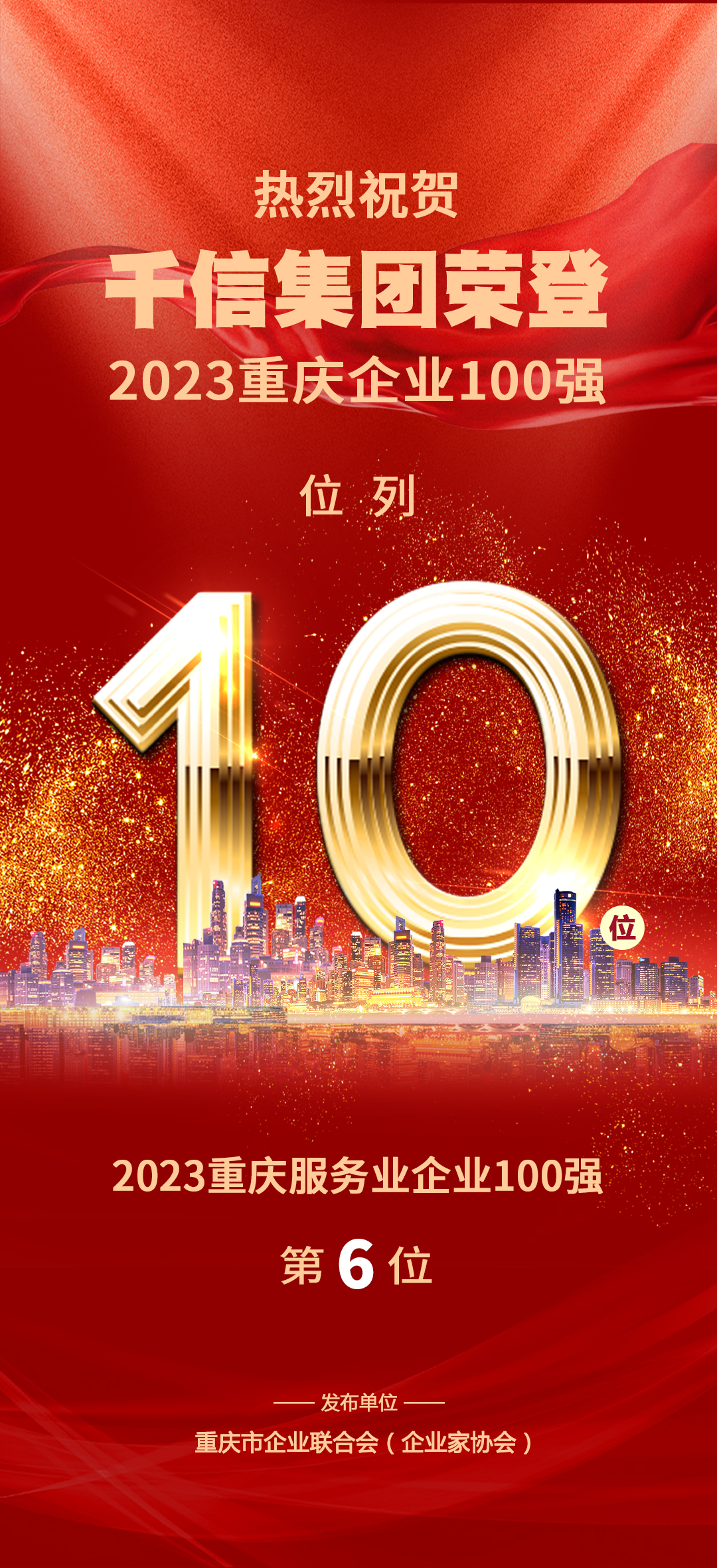 重庆千信集团连续6年跻身重庆企业100强、重庆服务业企业100强,2023年,首次进入重庆企业100强前十,位列第10位。同时,荣列2023重庆服务业企业100强第6位。