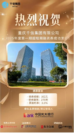 2025年4月17日,重庆千信集团有限公司2025年度第一期超短期融资券成功发行。本次债券发行金额3亿元,债券期限270天,利率3%/年,发行主体评级AA+(东方金诚、中诚信评级)。债券主承销商及簿记管理人为中国光大银行,联席主承销商为重庆农村商业银行,法律服务机构为中联(重庆)律师事务所。