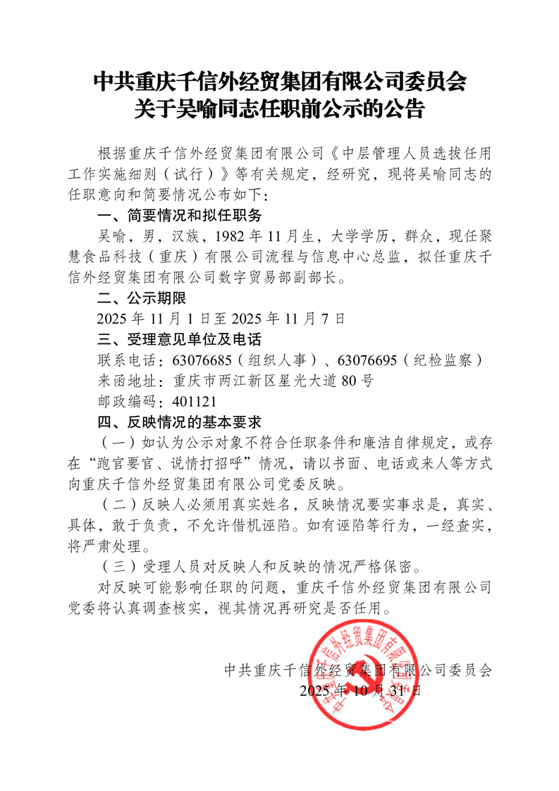 关于吴喻同志任职前公示的公告